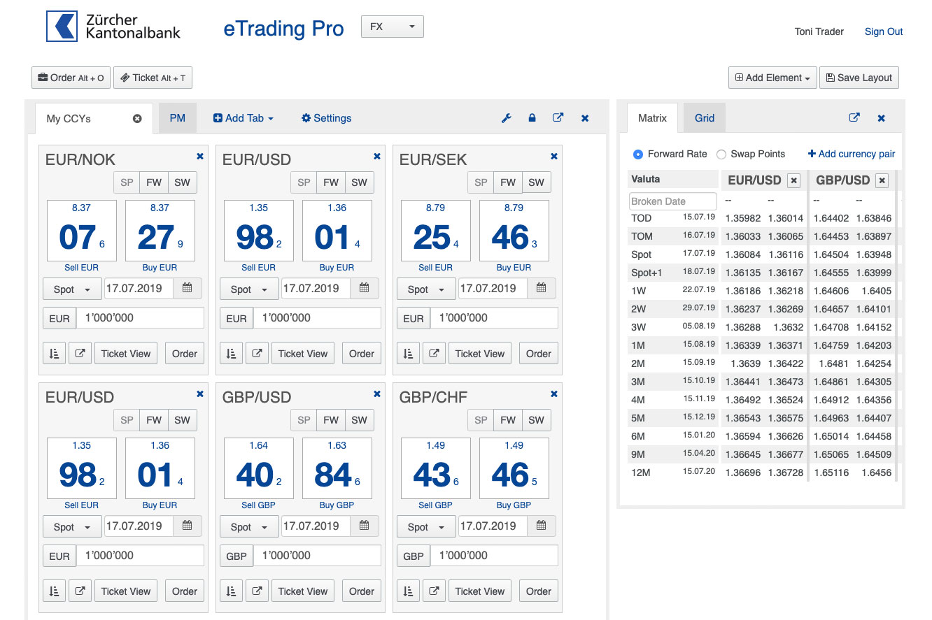 I was called in by executing agency Divio to help the Zürcher Kantonalbank to reboot their custom eTrading platform. The assignment was one of the most challenging parts of the project: the foreign exchange trading application «eTrading Pro FX».