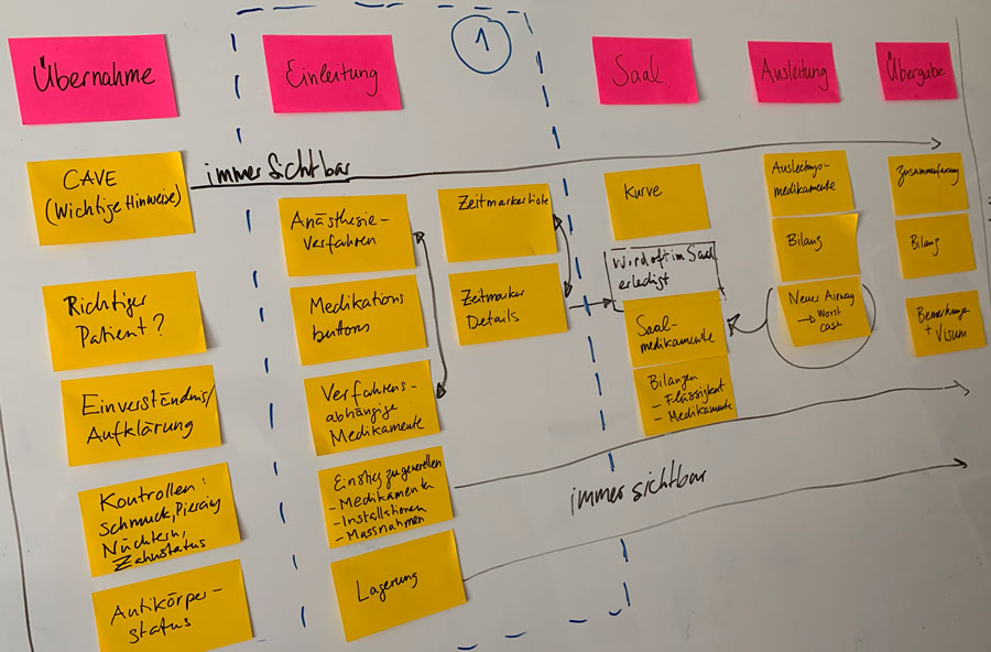 cistec is working closely with the anaesthesia staff of the Balgrist Hospital in Zurich to develop this module. The anaesthetists had put together a list of requirements for the electronic logbook before I joined the project.  The document reflected their expectations of what the software would be able to do. However, it contained little information regarding chronology (what is done when) or choreography (who does what).