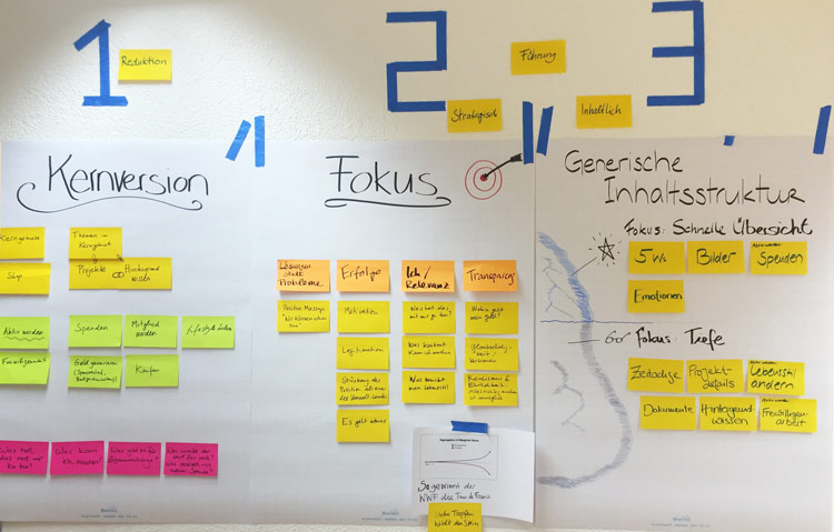 At the start of the project we conducted stakeholder workshops to learn about goals, user needs (internal and external), challenges and responsibilities. We developed the core of the content strategy based on the findings of the workshops and the analysis of the current state of the content. The center of our work was a clear focus on the five global core subjects of the WWF. We decided that on the new site, informations on projects and background knowledge can only be published, if they can be directly assigned to one of the five global core subjects. Additionally, four rules were set up for content: show solutions instead of problems, highlight success, demonstrate relevance to users, create transparency.